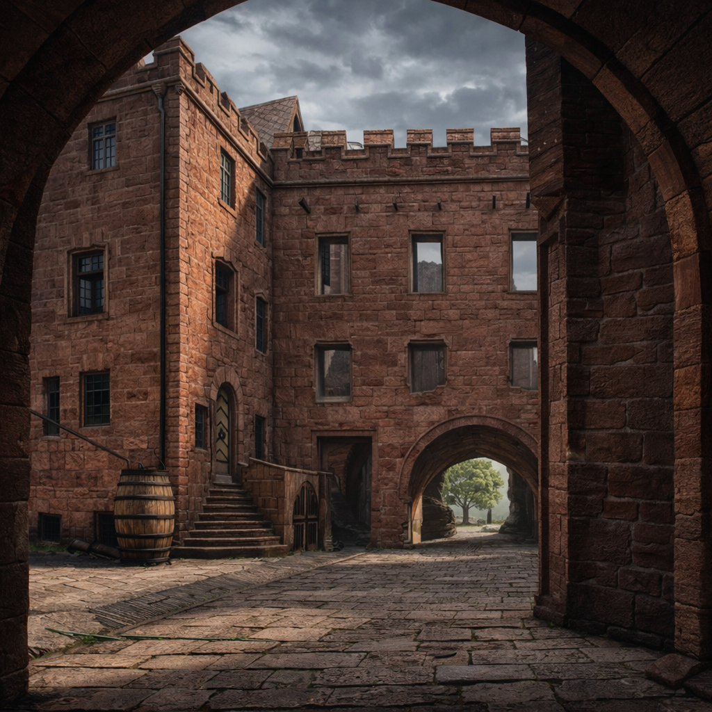Du bist im Innenhof der Wasserburg und blickst Richtung Süden.