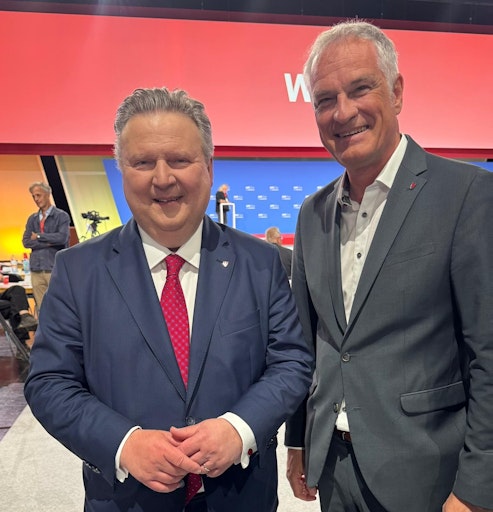 Mario Leiter gratuliert Michael Ludwig zur klaren Bestätigung am Landesparteitag